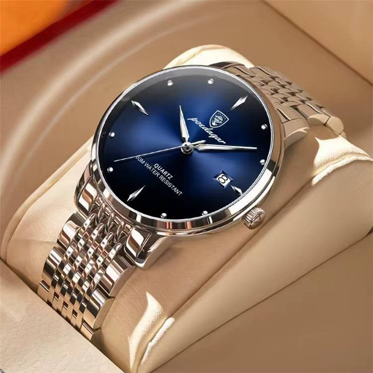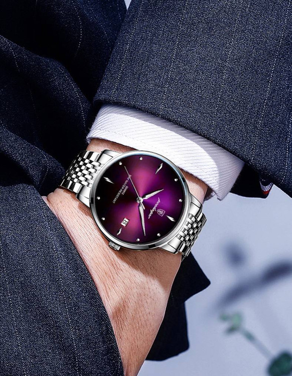 این ساعت مچی از برند اور جینال پوداگار با بدنه استیل که رنگ آن کاملا ثابت و در برابر آب مقاوم با رنگهای صفحه چری،سورمه ای،سبز مناسب ترین گزینه برای ست های کلاسیک ،رسمی و مجلسی میباشد