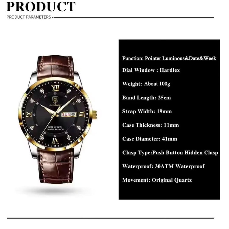 ساعت مچی اورجینال از برند پوداگار مناسب برای استایل رسمی و کلاسیک آقایون شیک پوش و سخت پسند. موومنت کوارتز، بند چرم ضدآب، نمایش ایام هفته و ماه، شیشه کریستال ضدخش. یکسال گارانتی.